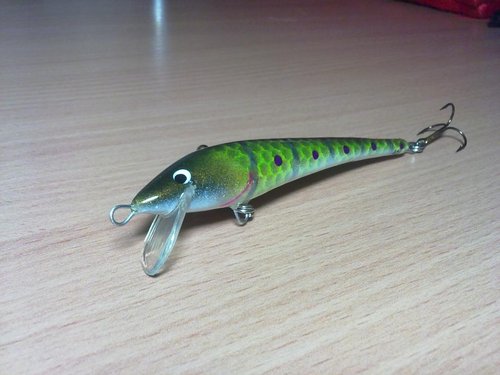 Из шести моделей на фотках, две модели огружены. Те модели, котрые я делаю для рек, ими ловлю взаброс, иногда ставлю на дорожку(речную). Троллинговыми моделями взаброс ловлю очень редко. Бывало пару раз- ловил на Minnow Z на маленьком лесном озере. Окунь и щука реагировали положительно.