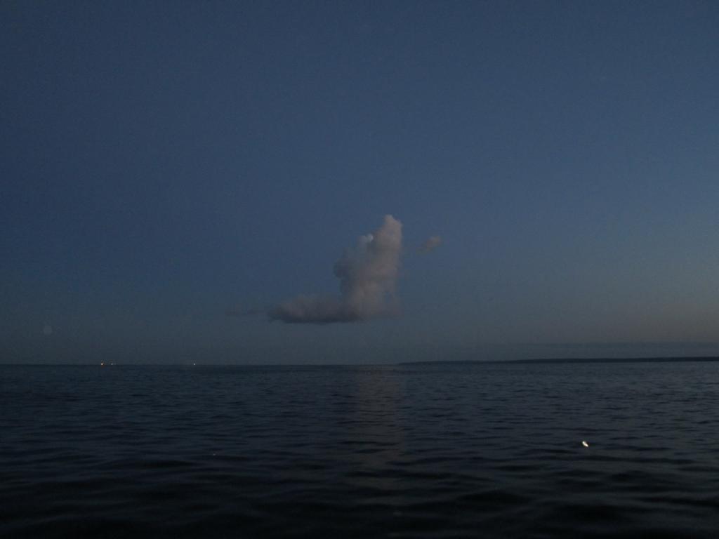 Стало смеркаться - поставил жёлтые флюрики и дело вроде начало налаживаться, как вдруг налетел ветер, пригнал дождь. Дождь хоть и тёплый, но мокрый, а к такому развитию событий мы не были готовы... Намокли и погребли к берегу...