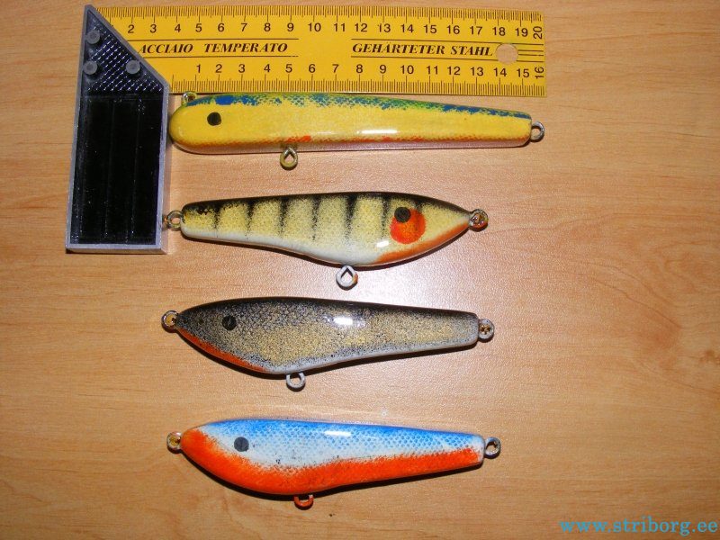 valex_77, Желтый с синей спинкой - красавец... Его бы еще покрасить более продвинутым способом. А вот похожий по геометрии на вашего "тигра" джерк у меня получился сабуокером -не то свинца пожадничал, не то скулы как у катера ( на самом деле так оно и есть - морда выглядит в плане почти как треугольник вершиной в низ)... Ну а реплики Слайдера незабвенного - куда ж без них, наверное многие с этого и начинали...