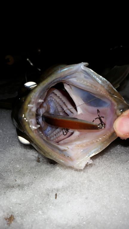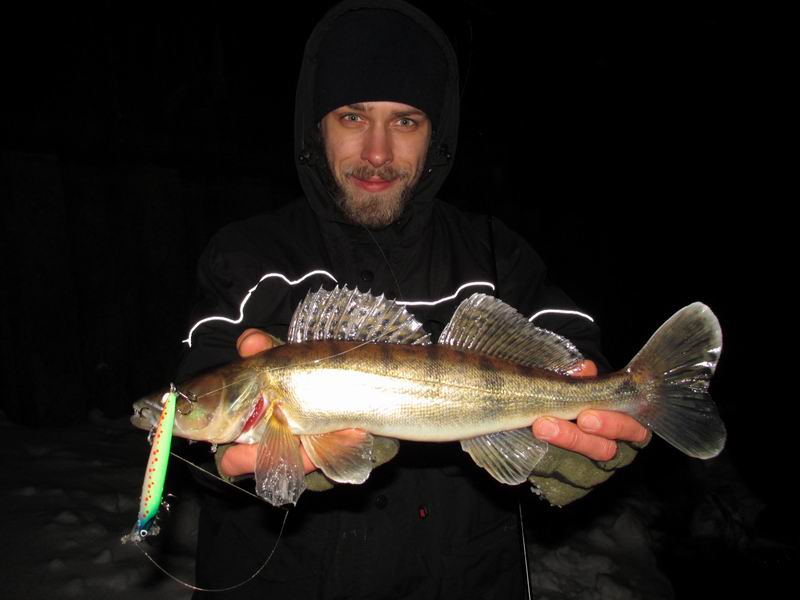 Намечавшийся в четверг вечером резкий скачок давления вместе с похолоданием не располагали к ловле, но Жека всё же уговорил меня выбраться на водоём. С трудом пробившись сквозь пробки, мы прибыли на реку около 9 вечера. Первый час ловли был абсолютно не интересен. Надеясь попасть в цвет и подобрать нужный горизонт, который раз меняю приманку — настала очередь Модели №5 от A. Smirnoff в цвете 506. Первый же заброс приносит злую поклёвку, и через несколько секунд, первый судак позирует у меня в руках. Ещё два заброса — и совсем маленький клыкастик виснет на воблере буквально под ногами. Тем временем, Жека ловит довольно упитанный экземпляр, под килограмм весом. Следующая поимка снова моя — некрупный судак жадно вцепился в воблер ручной работы. Где третий, там и четвёртый — через пять минут ловлю ещё одного, после чего выход прекращается. Через некоторое время, напоследок, Жека достаёт небольшую рыбу с меляка. Поклёвка была одиночной, и не став тратить время, мы решили сворачиваться.