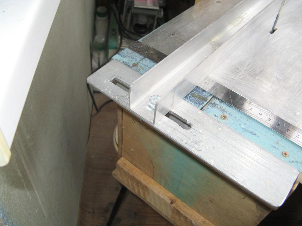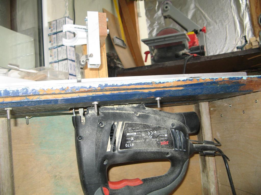 Сверху лобзик прижат листом дюраля. Из двух уголков и профиля сделана направляющая