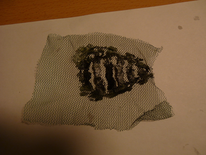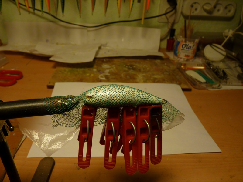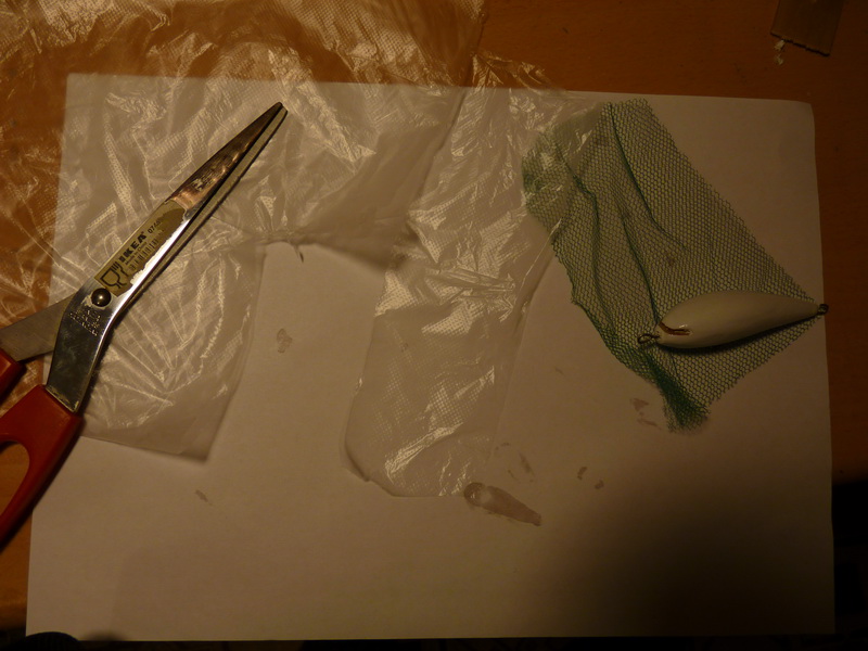 - Берем самый тонкий упаковочный п-этиленовый пакет и кусок сетки, вырезаем - на воблер накладываем пакет, сетку и крепим прищепками - закрашиваем силиконом "фон". Силикон лучше взять цветной, с прозрачным плохо видно.