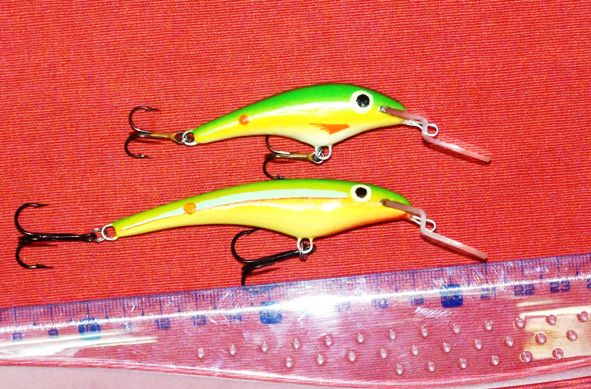 Оба работают на "отлично". Удлиненная не только нижняя, но и верхняя часть. Вертикальная плоскость уменьшена. Петля вынесена в перед. Хотел сделать воблер, обладающии способностью глубоко заныривать и также с работои ступенки. Одним словом - попал. Не смотря на сравнительно маленькие размеры - достигают 2,5-3м. Только забросить трудно - легкие очень.