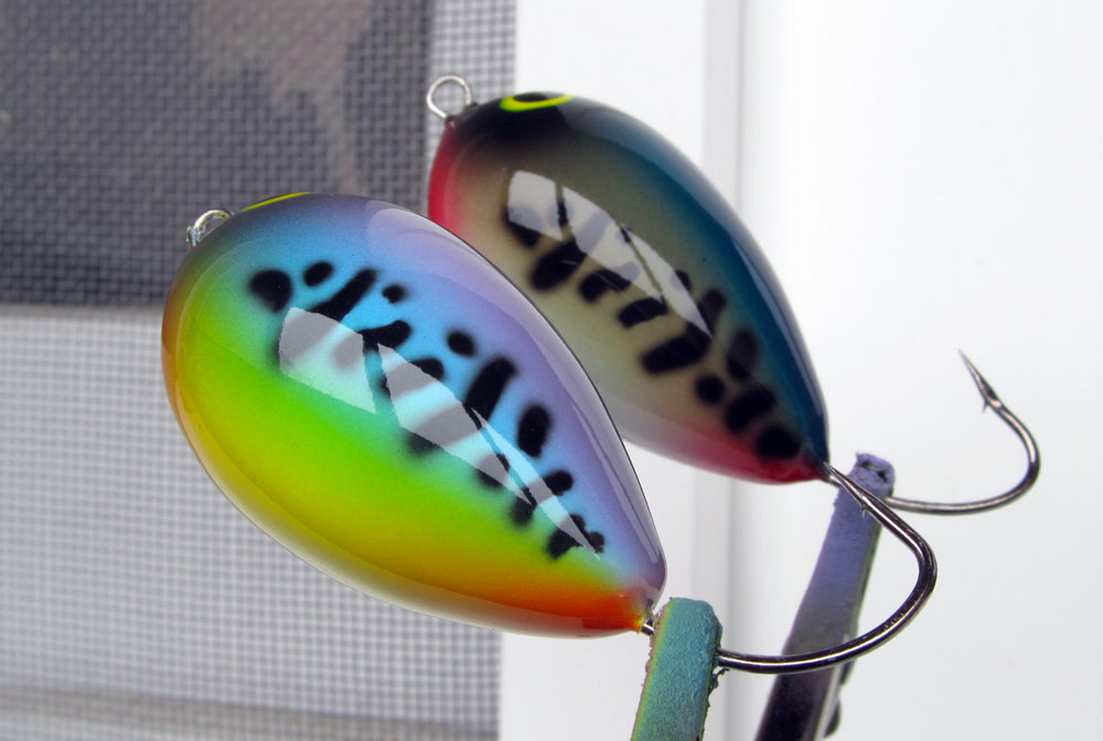 В этот раз под рукой оказался шприц с КПТ-8 (термопаста). Нанес белые точки и покрыл яхтным лаком в 4 слоя. Да, огрузку делал после затвердевания пластмассы - не понравилось, выхлоп такой же, а времени тратится больше. Причем при сверлении пластмасса наматывается на сверло и потом плохо вышкрябывается: пришлось кинуть сверло в ацетон - сама отвалилась. На этом пока и остановлюсь, думаю оторвать сразу не оторву, а больше вроде и не надо. Так что плавно перемещаюсь в тему про спинербейты - покажу что сделал.