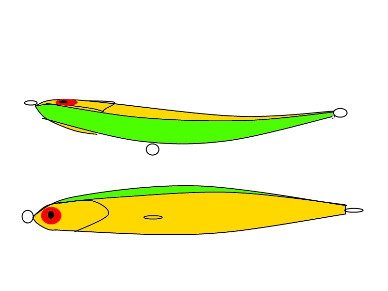 только наоборот. Смысл сделать такой для холодной воды, воблер будет тонущий, и при проводке должен зигзагами подниматься к поверхности а на паузе падать вниз. Интересно ваше мнение может получиться то что я хочу или я ошибаюсь.Оригинал из за гнутого тела стремиться вниз, мой расчет в том что при обратном изгибе будет подниматься вверх.