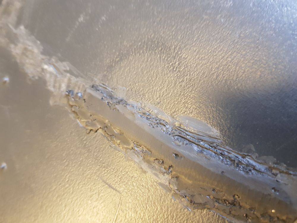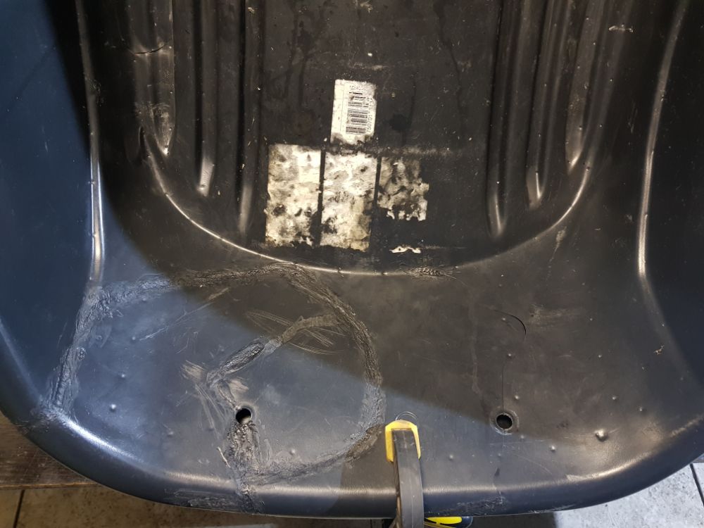 Так же с другой стороны, снял проволку, заделал её дырки и трещину под ней, а потом с одной стороны наварил пластик перекрывая первый шёв по поверхности, прижимая плотно к разогретой поверхности шва пластик пальцем в перчатке кожаной. Не вижу смысла усиливать металлической сеткой, всё держится крепко, перед вторым швом проверял на просвет и дырки подварил. Паяльник 100 ват, жало согнул под вопросительный знак для удобства. Конечно это надо делать в хорошо проветриваемом помещении, а лучше на улице, желательно в тёплую погоду.