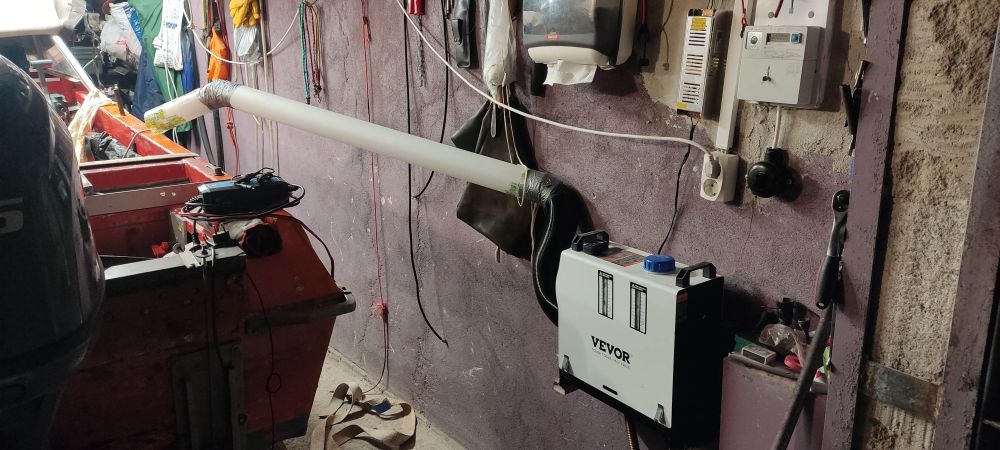 Прихожу в гараж, запускаю от аккамулятора 12 вольт на максимальную мощность минут 15, потом выставляю на 15 градусов и уже через час градусники показывают температуру в разных углах от 9 до 11 градусов. Учитывая отсутствие теплоизоляции результат не плохой, пол сохнет полностья за два дня, гоняю обычно часа 3-4, с уличной температурой 7-3 градуса +, расход в неделю около 5 литров дизельки.