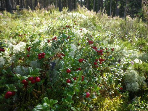 Брусничка. Ладонь подносишь, сама сыпится. Вкусно