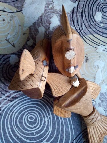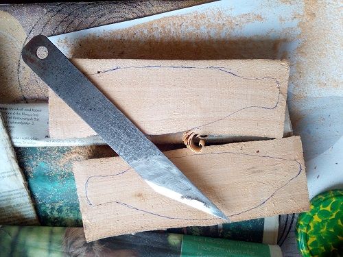 Вид сверху нарисовал произвольно, приблизительно 2 части ширины к 3 частям высоты. Вырезал ножом. Ножовчным полотном разделил на сегменты.Из обрезков и оставшегося сегмента с трещиной выпиливаются заготовки для плавников. До необходимой толщины довожу рашпилем и крупным напильником. Лобзик, ласточкин хвост.