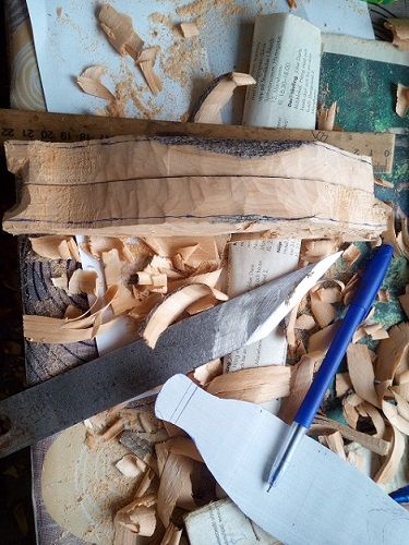Внутренние поверхности довожу до плоскости рашпилем и плоским напильником. Вид сверху: габариты не стесняясь делаю топором, точно по линни довожу ножом. Склеиваю точечно ПВА, в сушку на несколько часов.