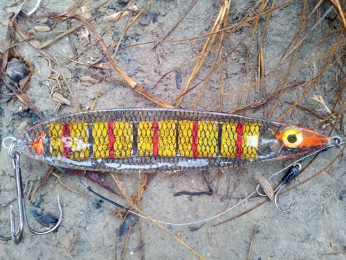 Добрый день. Результат воплощения еще одной идеи. Хотелось бы создать деревянную "силиконку". пока полученные результаты далеки от желаемого. Игра хвоста получилась слабая, скорее всего влияет вариант сборки на двух нитках. Все таки у силиконки хвост играет не из стороны в сторону, а как бы скручивается, при данном варианте сборки скручиваение сильно ограничено. В дальнейшей работе попробую собрать на одной нитке. Огрузку делал ближе к носу, для наклонного положения в воде, но не учел плавающий хвост, который "опрокидывает" приманку почти до вертикального положения. Думаю, что оптимальное расположение огрузки в районе плавников. Также для получения большей стабильности огрузку попробую располагать ниже (в этой приблизительно 5мм от нижнего контура).