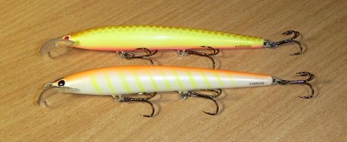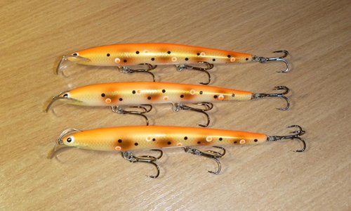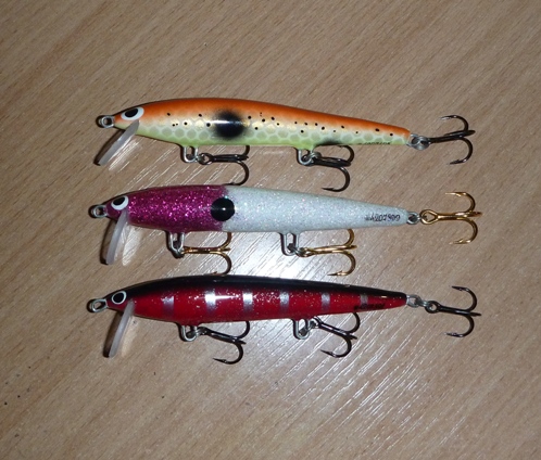 Эти воблеры на лосося. Летят хорошо, играют тоже хорошо! А нижний, выловил пол реки в Новгородской области, правда не большие щучки и окуни, но количество впечатляет!