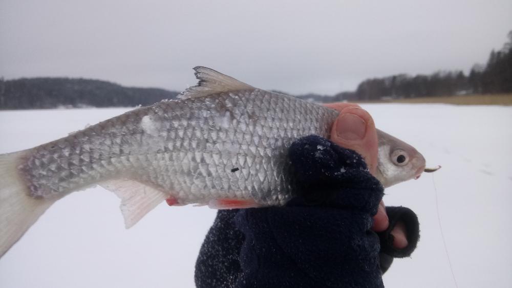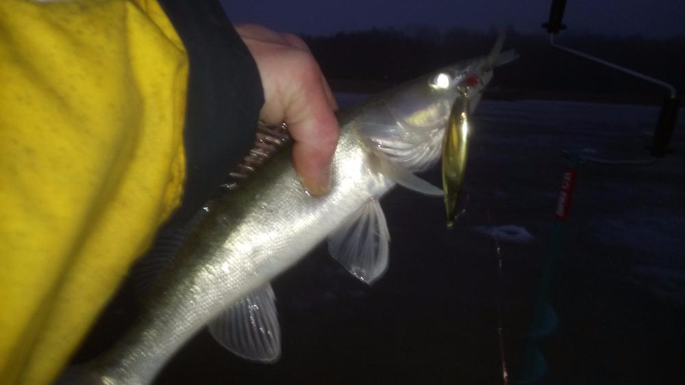 На льду ещё в сумерках были, народ присутствовал уже. Ловили на вертикалки с подсадкой хвостиков корюшиных. Лёд прим. 8 см. и ходили смело. Один из знакомых поймал окуня доброго, другой - судачка еле в размер, я тоже одного только поднял, не размерного - утопил его после фотосессии. В 12 дня со льда ушли, рыбы больше не нашли.