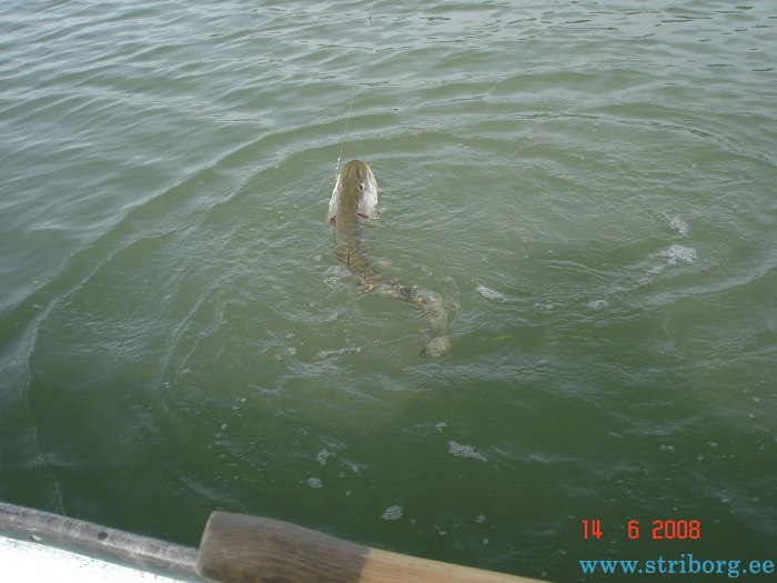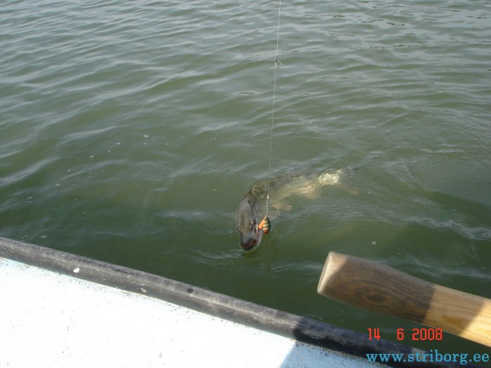 Плавно уходит в сторону, потом просто стала как пень. Ни туда, ни сюда. Глубина около пяти метров в этом месте. Начал её выкачивать помаленьку, вроде пошла.. Потом резко в сторону, метров пятнадцать шнура смотала. В лодке стою, палка в дугу... рыбы не вижу вообще, хотя вроде уже рядом. Рывок под лодку, бегу к центру лодки сам, напарник успевает мотор поднять, вроде обошлось.. Раза четыре щука под лодку уходила - не удержать было ( всего минут десять этот цирк длился). Потом всеж показалась во всю свою красоту у поверхности, я на вскидку кил шесть дал ей. Потом уже, вытащенная, при замере оказалась 7.300 и длиной 1м.03см. Колебалка 26 гр. оказалась заглочена по самые помидоры, т.е. жабры и тройник раскровянил жабры конкретно, особенно когда попытались блесну извлечь.