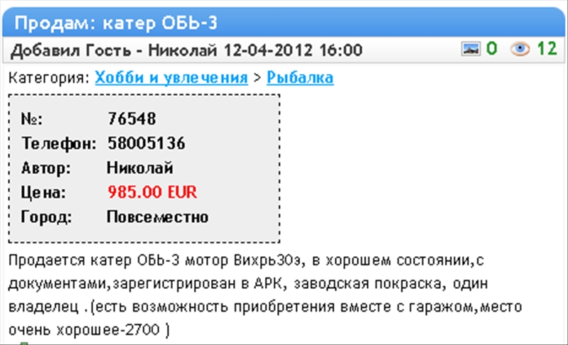 Объява сегодня попалась, похоже нарвитянин продаёт, интересная лодочка, шустрая, не знаю правда в каком состоянии, но кто захочет лично осмотрит: