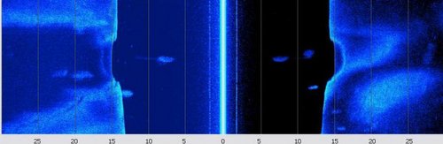 На картинках одно и тоже корыто лежащее на глубине 7м. На первой оно сосканировано в режиме торпеды с заглублением 3м на 6м кабеле, 2,5 км/час. На втором в статике с опусканием датчика до высоты 1,5м. На этой картинке два трубопровода на глубине 14м, скорость 1,7км/час, волна до 0,4м, заглубление 3м: Это экспериментальная база
