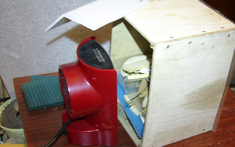 Поначалу использовал его как попало, быстренько слепил ему ёмкость из всякой всячины... Но затем всё же сделал к нему более подобающий аксессуар. До этого подсушивал заготовки над перевёрнутым абажуром настольной лампы. Результат устраивал, но по удобству использования тот вариант не шёл ни в какое сравнение с нынешним.