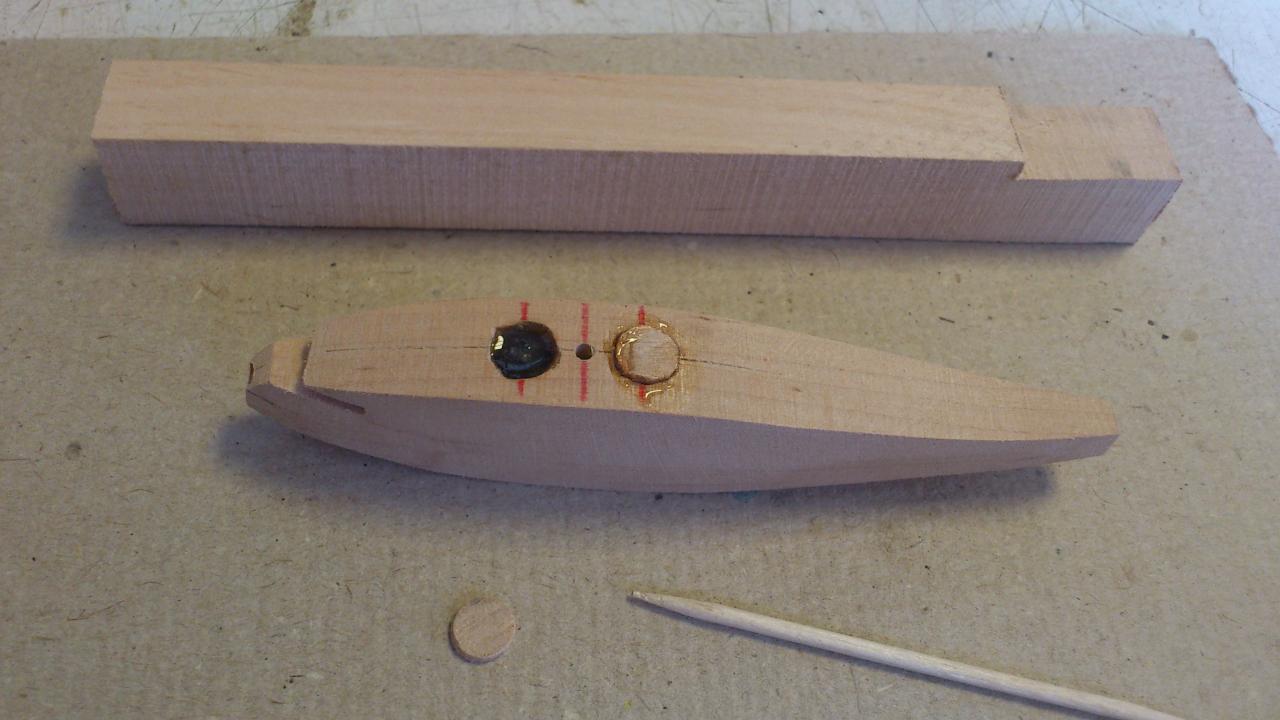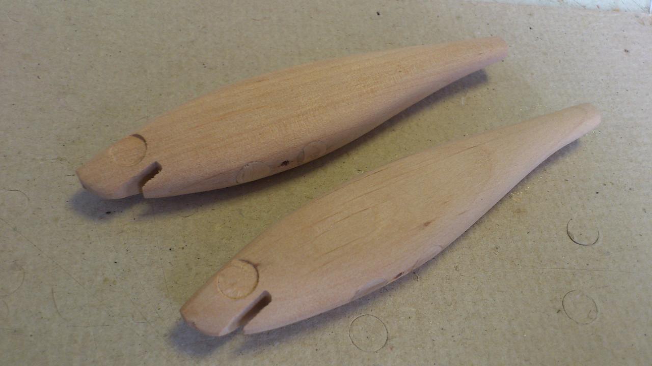 Чтобы огрузить эту модель воблера, я использую свинцовую картечь ᴓ6.5мм. Расположены грузики спереди и сзади брюшной петли. Вставляю по одному в отверстия того же диаметра, что и картечь, а её перед запрессовкой я немного прокатываю по столу, что бы у сферы сделать немного цилиндрический поясок. Так как заготовка из ольхи, то для огрузки медленно всплывающей модели нужна картечь такого диаметра. Если брать другое дерево, например липу или абаши, то потребуется или дробинки большего диаметра, или вставлять их две, в одно отверстие. Тогда эти отверстия должны быть соответствующей глубины, но чем ближе к продольной оси воблера находится груз, тем больше проявляется "валкость" в его игре. Это нужно учитывать. Картечь вклеиваю на прозрачный пробионат, а сверху глушу отверстие деревянной заглушкой, высеченной из той же ольхи. Получается шайба ᴓ6.5 мм и 1.5-2 мм толщиной. После сушки придаю воблеру уже окончательную форму, высечкой делаю углубления для глаз. В этих моделях я не стал использовать цельный каркас, решив обойтись петлями-скрутками. Две из них - брюшную и заднюю я делал длиной 15-20 мм, переднюю сделал 25 мм длиной. Все петли скручены из нержавеющей проволоки диаметром 0.83 мм, посажены на эпоксидную смолу, смешанную с опилками. Перед установкой петель отверстия ᴓ2мм я заполнял получившейся массой, выдерживал минут 10, потом заполнял ещё раз, поскольку клей впитывается в дерево, и тогда уже вставлял петли, выравнивал и отправлял всё это сушить на горячую батарею.
