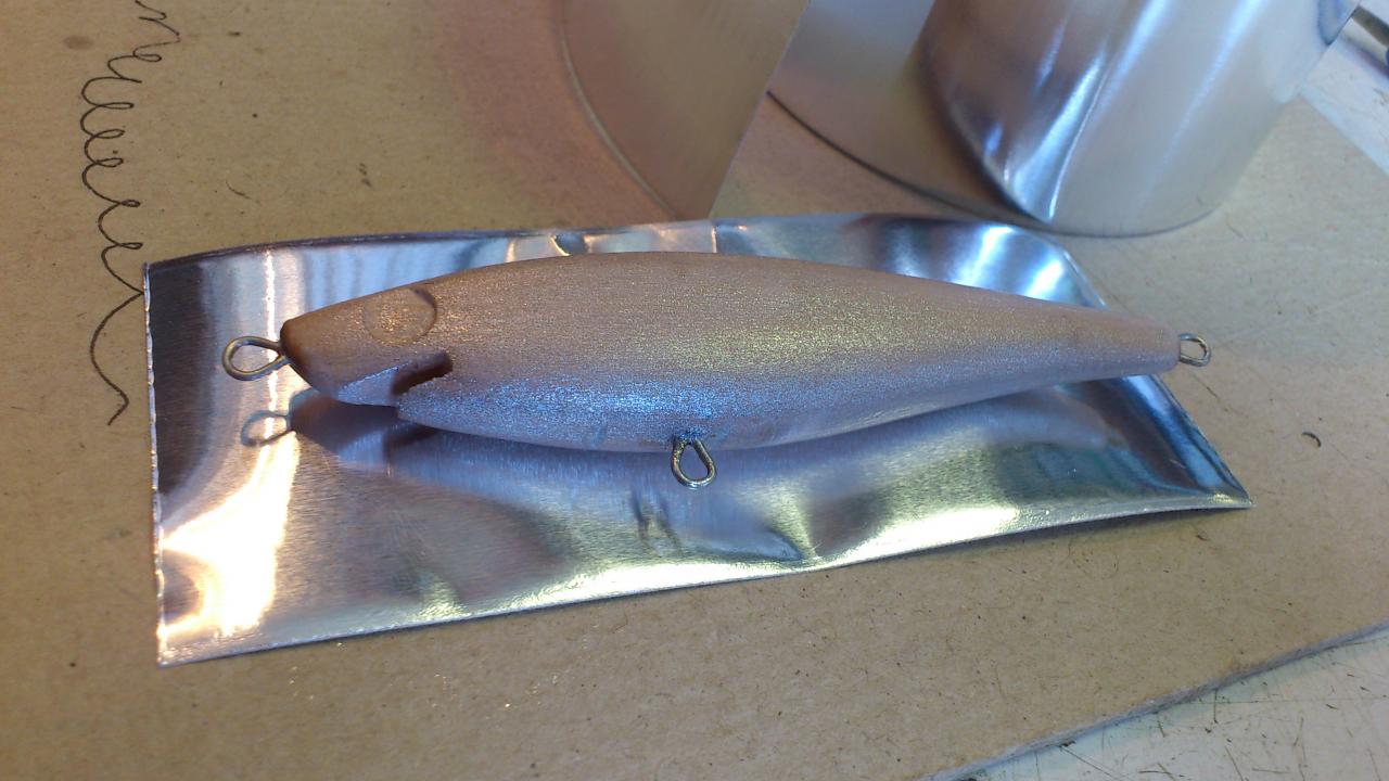 . После проверки крепости получившейся конструкции я пропитываю заготовки в жиденьком растворе прозрачного пробионата. Этот раствор пропитывает дерево, но оставляет его естественный цвет и текстуру. Это нужно для следующего этапа - нанесения "базы". Базовым цветом является серебристый акриловый металлик. Наносится кистью в один-два слоя. Когда краска высохнет, воблер окунаю пару раз в раствор прозрачного пробионата, чередую голову и хвост, что бы слои выравнивались.