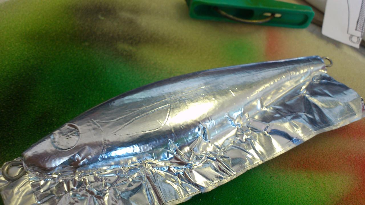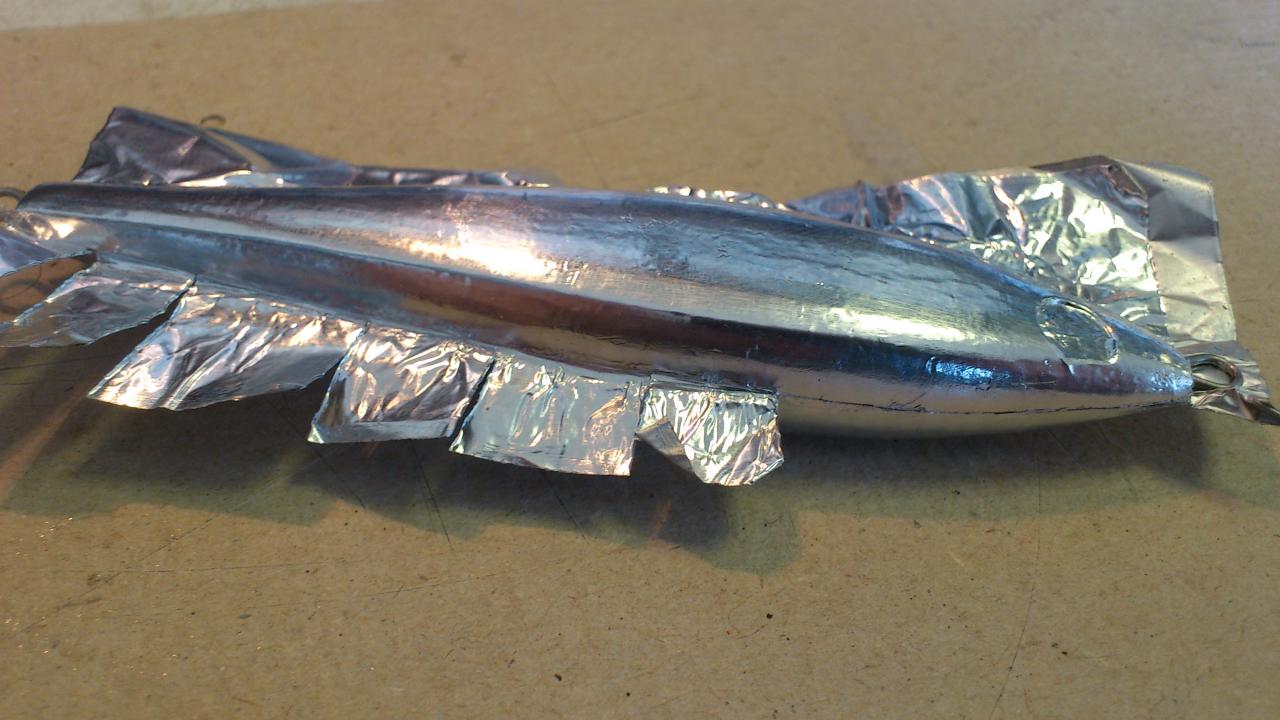 О фольге скажу следующее: наверное руки у меня ещё не достаточно выпрямились, что бы готовые вырезанные части клеить на воблер. Идея такая меня посещала, но пока что клею так. Полностью весь воблер я не разглаживаю фольгой. Ту часть, что будет отрываться, я просто приглажываю немного и всё. А вот там где спинка и голова - там уже всё "по-настоящему"