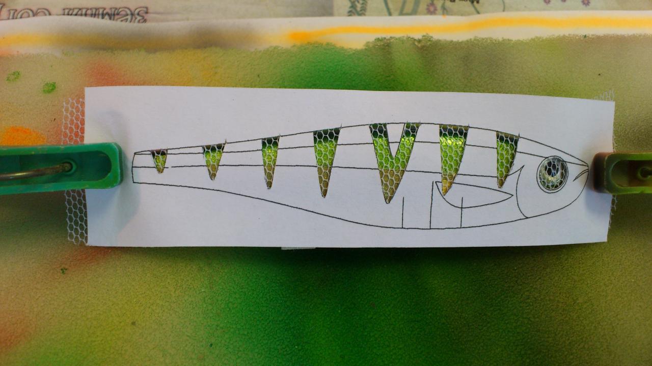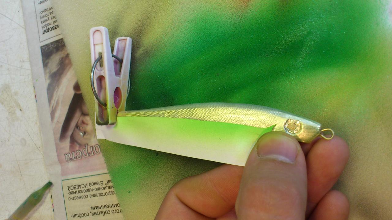 Этап первый: наношу лёгкий слой жёлтой краски. Краска батик. Покрываю почти весь воблер, кроме спины - она будет тёмной, почти чёрной, поэтому не стоит тратить на неё время Этап второй: приложив трафарет, закрашиваю фольгу светлым зелёным цветом Голову крашу только сверху, а то, что ниже глаз, закрываю пальцем. Акриловая краска легко смывается спиртом. Третий: Тёмным зелёным покрываю спинку воблера, а брюшко закрашиваю белым. Укрывистость оставляет желать лучшего, поэтому наношу много слоёв краски на брюхо. Белый тон нужен для слоя флюорисцентной оранжевой краски. Так же этой краской закрашиваю и плавнички. Они, к стати, служат не только элементом декора, но и выполняют функцию контрастного пятна. Это так называемые "точки прицеливания", хотя их необходимость является предметом многолетнего спора
