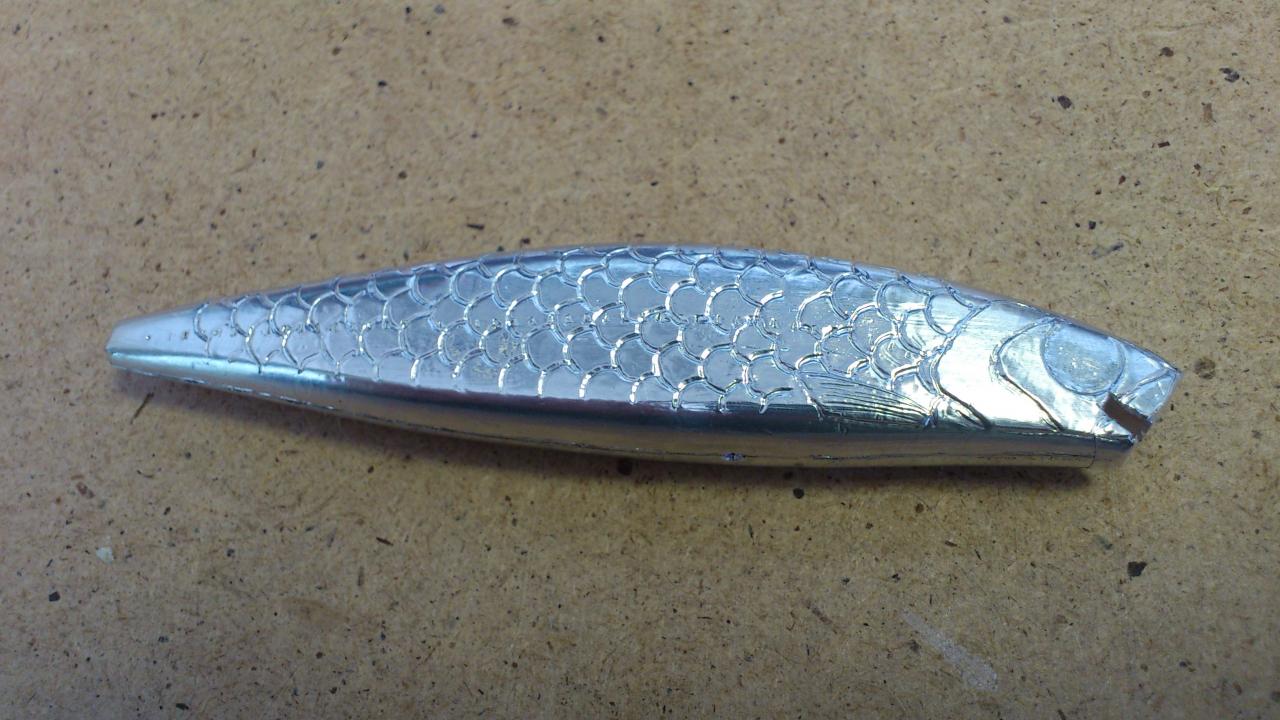 Когда вся работа сделана с двух сторон, заготовку протираю стиркой-ластиком и обклеиваю фольгой, затем проглаживаю пальцами и зубочисткой продавливаю немного фольгу по проступающим чешуйкам. Получается более чёткая линия. А можно не парится с нарезкой и сделать накатку Когда вся отделка завершена, отверстия рассверливаются сверлом немного большего диаметра и в них вклеиваются петли из нержавейки. Вклейка петель в последнюю очередь обусловлена тем, что без них обклеивать фольгой приманку куда проще и аккуратнее получается. Вся эта работа нацелена на создание красивой приманки, которую приятно брать в руки, зная, что в неё вложено много сил и времени А результат будет виден по количеству поклёвок. Но согласитесь, ловить красивыми снастями - уже удовольствие!