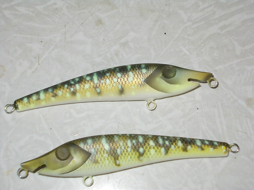 ... дуем с хвоста в голову(почти параллельно телу воблера) чёрной, или тёмнозелёной краской (в зависимости какую хотим щучку: светлую или тёмную, затем от головы к хвосту( с таким-же направлением потока краски) светло-золотистой спинку и бока (до середины) нижнию часть можно серебром...