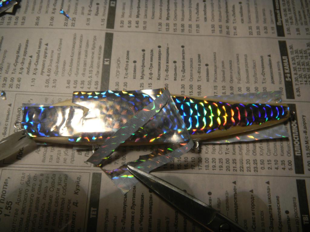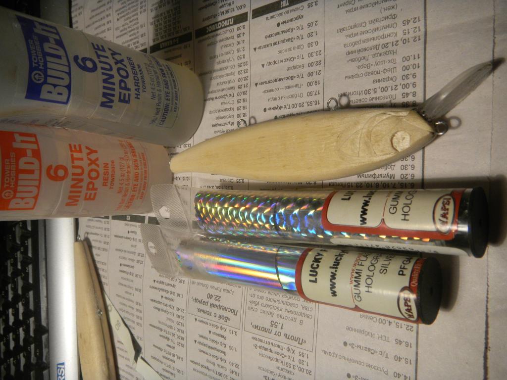 Доброго времени суток,решил поделиться способом нанесения галлограммы на воблерок.фото1-используемые материалы,эпо-6минутка(продается в магазинах по авиамоделизму,кто где купит)галлографическая пленка,оч тонкая(искать в магазинах для ловли нахлыстом)заготовка воблера-сделать самому.Теперь процесс,фото по порядку.Шаг 1-вырезаем полоски по ширине воблера,на воблере отмечаем границу галлогграммы.Шаг 2-наносим приготовленную эпо на место галлограммы,даем чуть схватиться,потом прикладываем пленку белой стороной и разглаживаем очень аккуратно,даем смоле высохнуть,лучше до полной кристализации(сутки).Шаг 3-Оккуратно за край снимаем пленку,края выравниваем мелкой шкуркой(р1000),покрываем прозрачной Эпо,у меня Megic Crystal,потом покраска,и т.д.Суперклеи для этой процедуры не подходят,растворяют рисунок,что-то на нитрооснове не пробовал,но боюсь тоже будут растворять.Готовые приманки выложу как закончу,спасибо за внимание.
