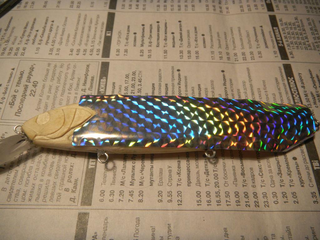 Вот результат,на фотках немного лучше видно, можно покрасить спинку в темнее цвет и воблер будет готов, блеск получается приглушённый, похож на блестящую чешую....
