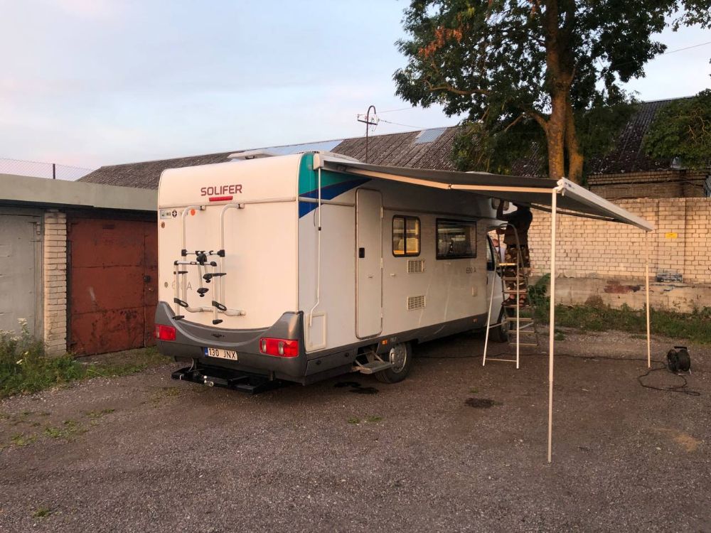 Тупо все сервисы были завалены работой и пробиться к ним было невозможно, да и не везде была возможность загнать трёх метровый кемпер. Пришлось делать самому. Ну и напоследок была заменена маркиза на новую во весь борт! Финн можно сказать обманул, сказав что она исправна. На деле мы её еле открыли, а потом замучились закрывать. Половина механизма попросту отсутствовала