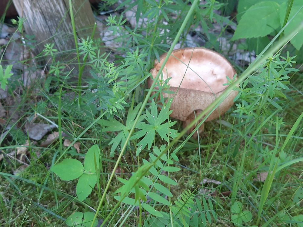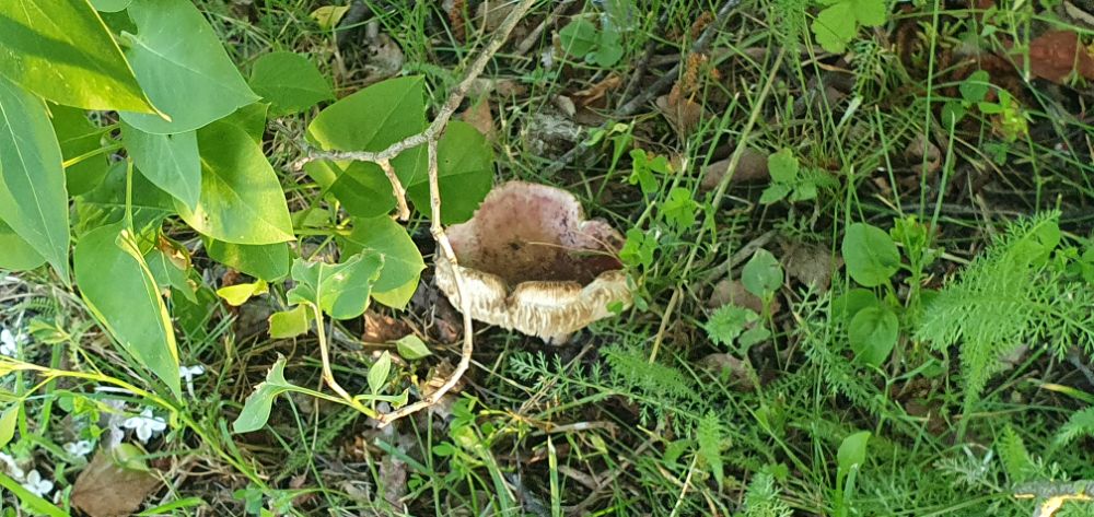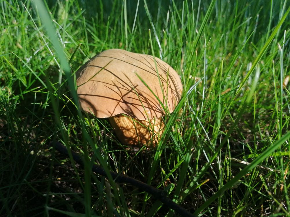 А вот пол часа назад сыроежка на моём газоне возле гараже, прячется под кустом.