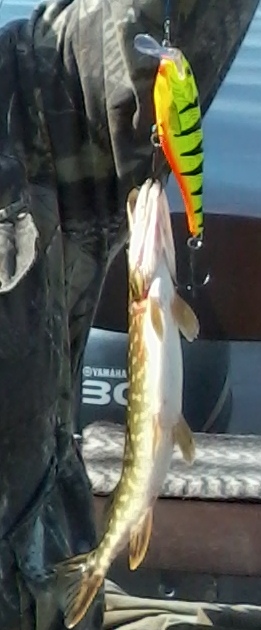 однако... терять мне нечего, распускаю дополнительно по второму борту другой воблер. Минут через десять загиб на ССР, достаю щучку-полторашку, ну вот, хоть кого-то можно с собой увезти, а то шестой час на воде и никого в мешке. Принимаю решение попробовать риппер совершенно ацкой раскраски, прежде на него не удалось взять никого. Распускаю воблер, забрасываю силикон, и только успеваю распустить снасть, загиб
