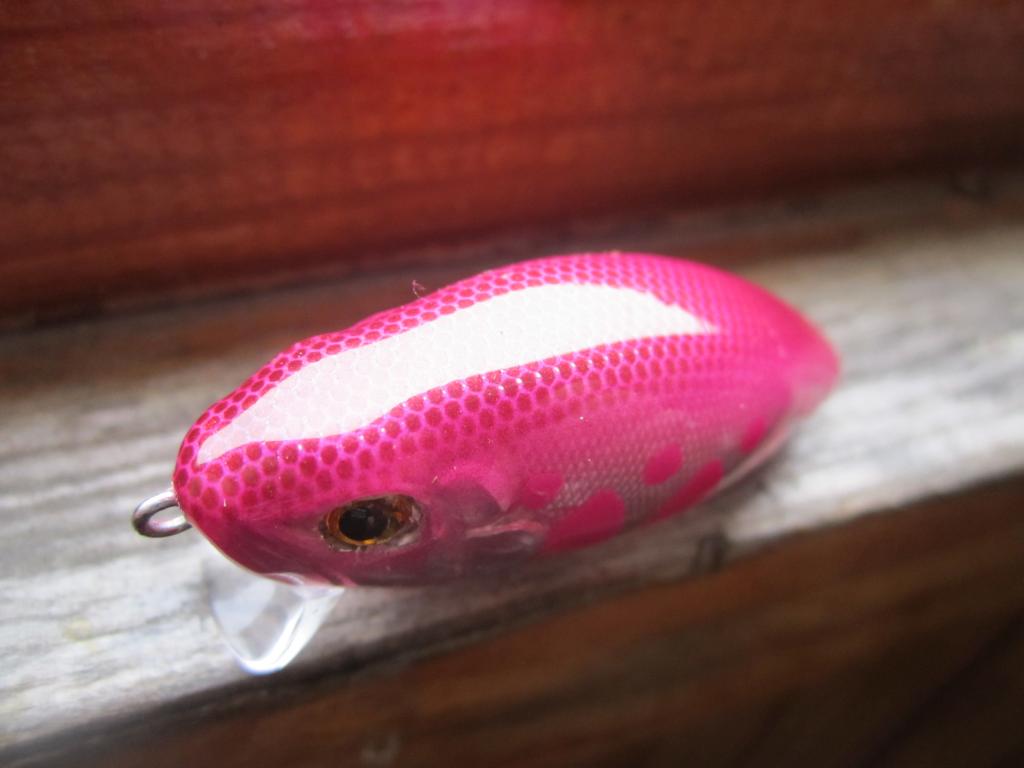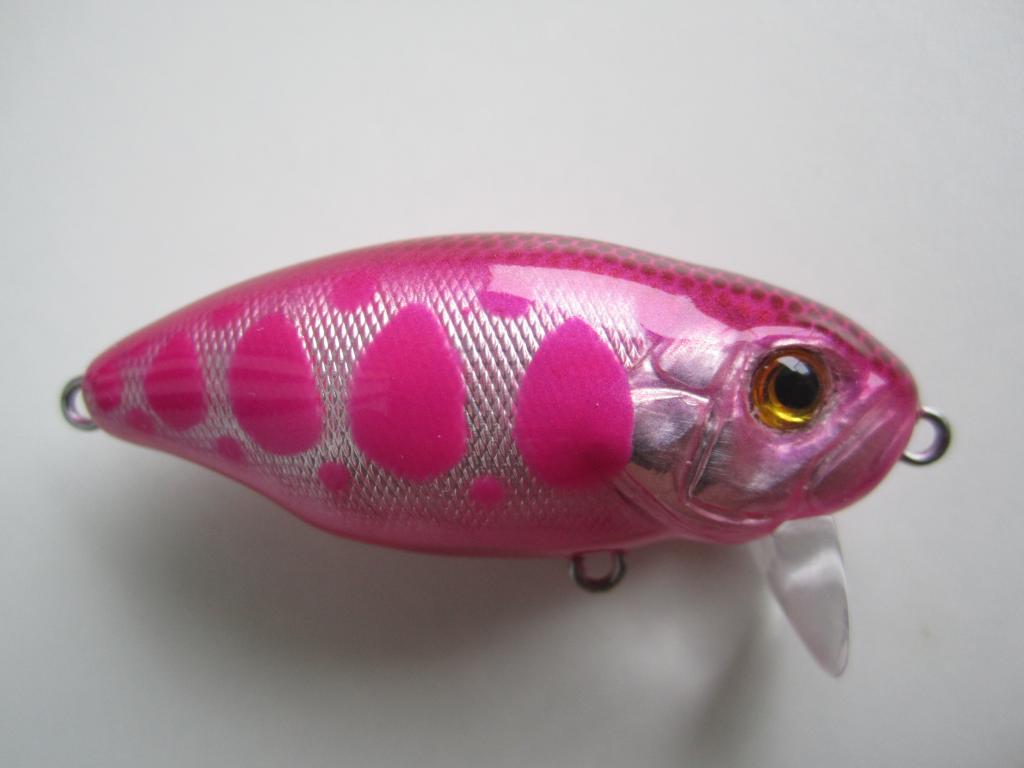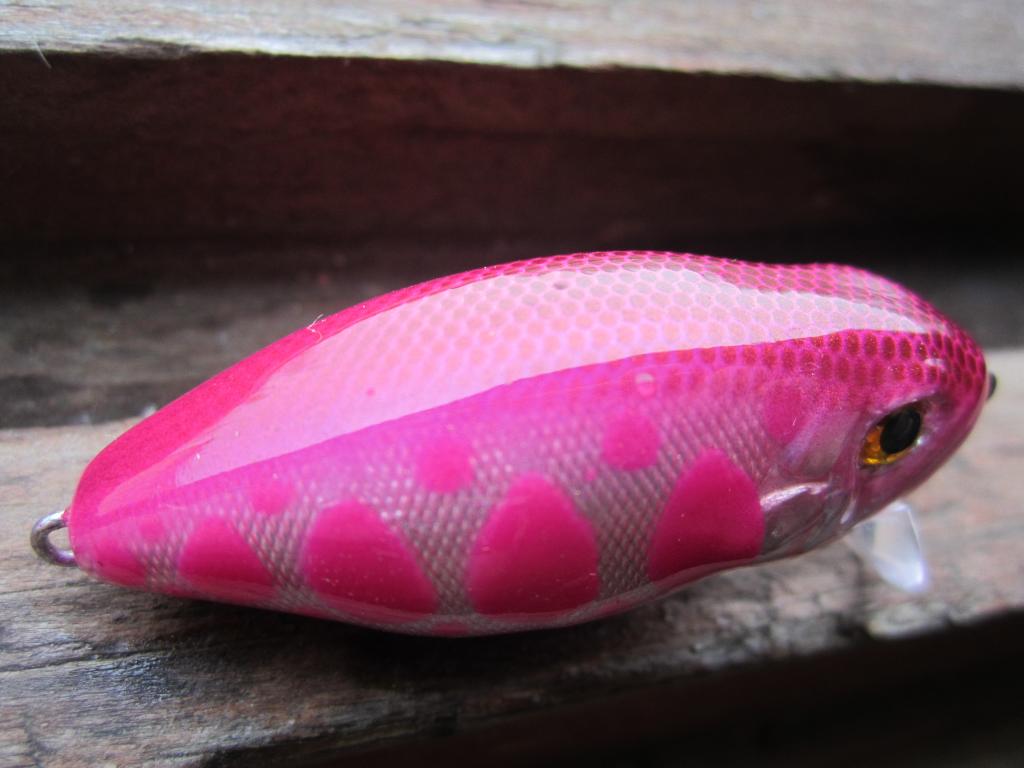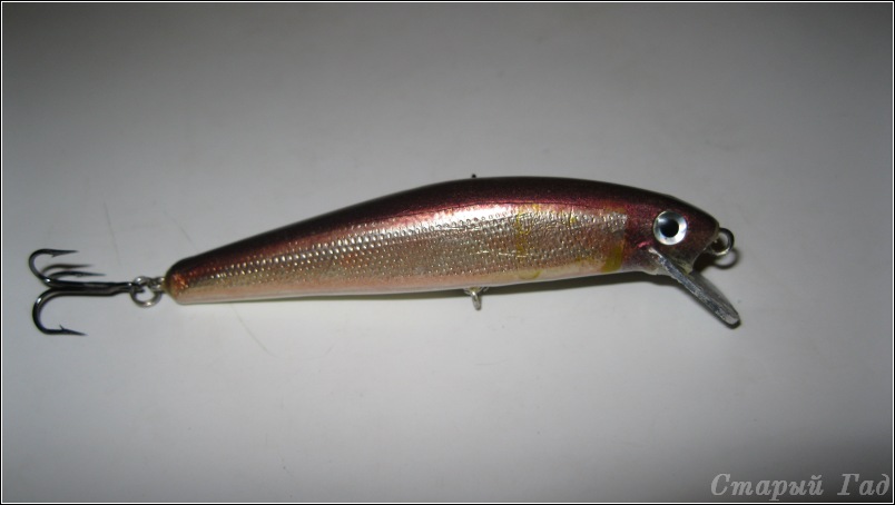 Поспели крайние в сезоне жидкой воды деревяхи. Одна опытно-серийная (наткнулся на давно уже сделанную заготовку из березы - брусок обработанный по виду с боку), модель КГ80 (килька горбатая 80 мм длиной). В отличии от своих сестер и братьев изменено сечение корпуса: пытался придать форму сечения L-minnow (в первом приближении - яйцо широкой частью вверх). Полного соответствия достичь не удалось (плохо подумал как "огранить" брусок), зато получился симпатично упитанный малек. Цвета перезревшей черешни (хотел получить смешиванием фиолетовый, но получилось то что получилось ... примерно такой цветовой гаммы были некогда воблеры польского Джексона). Огружен посредине между носовой и брюшной петлей, низко, двумя свинцовыми цилиндриками диаметром 5 и высотой 3 мм. С поводком 10 см из полевого кабеля и тройниками №8 - суспендер, на фото - с тройниками №10.
