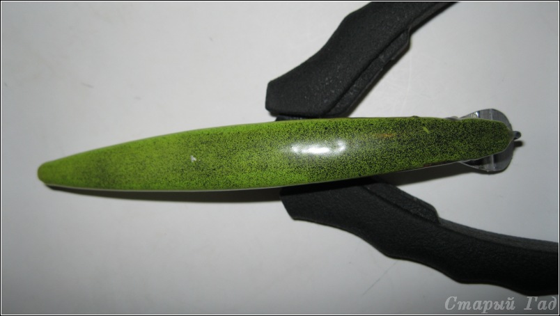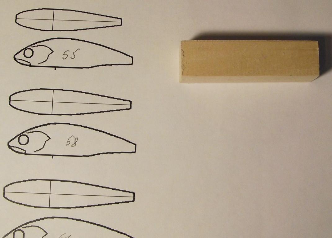 А теперь извечный вопрос "кто виноват и что делать?": одна из "строящихся" самоделок напрочь отказывается отзываться на дергинг. При рывке бодро изображает из себя пулбейт - "пилу" рисует. При этом при прямой проводке показывет довольно интересную, характерную для современных крупных минноу игру (с изрядной валкостью). Но мне то этого не надо. Вот и чешу репу - от чего сие может быть? Размер лопатки? Ширина на 2 мм шире корпуса в самом широком месте ( 16 мм супротив 14 при высоте тела воблера 17 мм и длине 118) длина - не велика, меньше чем у разловленного "соседа по серии" (в первом приближении - вытянутая капля). Угол врезки лопасти? Маловероятно - точно те 35 градусов по отношению к плоскому брюху приманки, как и на 3 "систершипс", что очень неплохо твичатся...Расположении огрузки - практически точно по ЦМ неоснащенной приманки (55 мм от морды при общей длине 118) и очень низко, насколько это возможно для вклеиваемого груза - свинцовый цилиндр диаметром 8 и высотой 4.5 мм. Сечение корпуса - точно нет: перевернутая трапеция основанием вверх избыточной устойчивости точно не способствует - проверенно. Единственное отличие от предыдущих вариантов - наличие 2 изолированных "плавательных пузырей" - чечевицообразных полостей расположенных симметрично ЦМ и выше горизонтальной оси ЦМ (центр 10 мм выемки приходится на высоту 8 мм от брюха, а ЦМ - около 7 мм).
