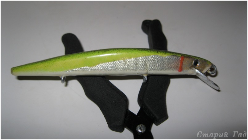 А теперь извечный вопрос "кто виноват и что делать?": одна из "строящихся" самоделок напрочь отказывается отзываться на дергинг. При рывке бодро изображает из себя пулбейт - "пилу" рисует. При этом при прямой проводке показывет довольно интересную, характерную для современных крупных минноу игру (с изрядной валкостью). Но мне то этого не надо. Вот и чешу репу - от чего сие может быть? Размер лопатки? Ширина на 2 мм шире корпуса в самом широком месте ( 16 мм супротив 14 при высоте тела воблера 17 мм и длине 118) длина - не велика, меньше чем у разловленного "соседа по серии" (в первом приближении - вытянутая капля). Угол врезки лопасти? Маловероятно - точно те 35 градусов по отношению к плоскому брюху приманки, как и на 3 "систершипс", что очень неплохо твичатся...Расположении огрузки - практически точно по ЦМ неоснащенной приманки (55 мм от морды при общей длине 118) и очень низко, насколько это возможно для вклеиваемого груза - свинцовый цилиндр диаметром 8 и высотой 4.5 мм. Сечение корпуса - точно нет: перевернутая трапеция основанием вверх избыточной устойчивости точно не способствует - проверенно. Единственное отличие от предыдущих вариантов - наличие 2 изолированных "плавательных пузырей" - чечевицообразных полостей расположенных симметрично ЦМ и выше горизонтальной оси ЦМ (центр 10 мм выемки приходится на высоту 8 мм от брюха, а ЦМ - около 7 мм).
