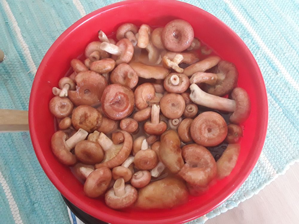 Дома высыпаю в подходящую тару, прижимаю грузом и заливаю холодной водой. Менять воду надо как можно чаще, хотя бы 3 раза в день и не менее 3 дней. В деревне просто корзину с крышкой закидывают в реку или ручей. Сам млечный сок условно ядовит и надо от него избавиться.