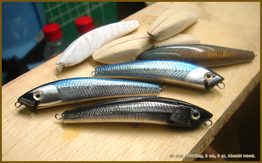 Выставляю фото из мастерской. Параметры воблеров на фото. До завершения осталось пару дней - полернуть "прыщики" на лаке, покрыть последним слоем LV и вклеить лопаты.
