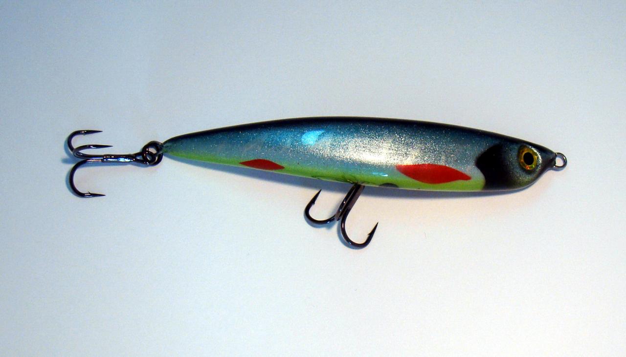 Покрашен из баллона и далее аэром Деколой. Покрыт эпо и 6слоёв LV-1. Глаза покупные. Внутри выбраны полости для лучшей плавучести и заложен бисер. Вес - пока не взвесил.