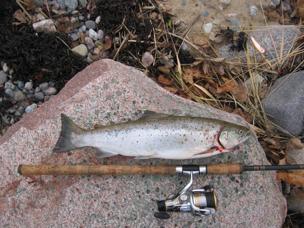 Сегодня тоже в кои то веки выбрался на море. На мыс, который мы себе наметили накатывали волны с двух сторон, разбиваясь бурунами. Зрелище красивое. Такого раньше и не видел. На самые злачные места из-за почти метрового наката не пробраться. Начали ловить чуть сбоку от свала. Через десять минут после начала рыбалки под самым тюльпаном кумжа едва в размер уверенно съедает мою блесну. Быстро сдалась, водворил ее в подсак-ракетку, отцепил и уворачиваясь от очередной волны подпрыгнул и в этот момент подсак развернулся по волне и рыбка поплыла восвояси. Дальше честно отработали несколько мест, но нигде ничего. На последней точке при нас пару небольших коллеги подняли. Закончили уже в темноте. Отдохнули вполне зачетно.