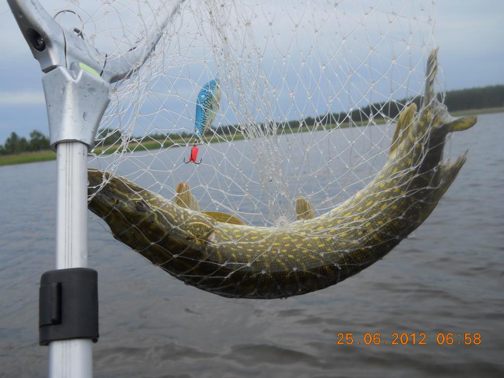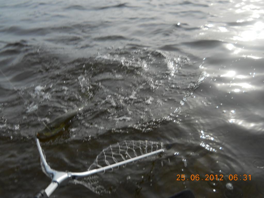 Поехали сегодня с Игорем на залив,на утреннею зорьку.В 4 утра мы уже вышли на воду: Игорь ,прикормив кромку камыша ,заякорился на карася...а я пошел проверять ближлежайщие ямки на придмет зубастой...Где-то в 5 утра первая пробежка... отошел метров 30,заброс,удар-сидит....Бойкая такая двушка-только к подсаку подведу -уходит от лодки метров на 10...наконец замучал подвел к лодке,и тут она делает мощный рывок под лодку, и вокруг ноги эл.мотора...