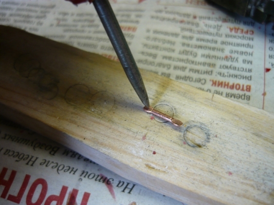 Под лесочные усы делаем два отверстия. Положив заготовку на деревянный брусок прокручиваем шилом отверстия так, чтобы леска плотно проходила. Почему шилом? Шило имеет коническую форму и отверстие соответственно получится коническим. Та сторона блесны с которой расположено основание конуса впоследствии будет наружной, потом скажу, почему. В отштампованных и протестированных в ванной блёсенках размечаем отверстие под одинарный крючок. Сверлим отверстие по диаметру заклёпки (медная проволока) и зенкуем с наружной стороны под шляпку заклёпки. На данном этапе, если нужно, можно блёсенки отполировать. Вставляем в отверстие заклёпку, надеваем на крючок бусинку , устанавливаем на место и приклёпываем. Заклёпку зашлифовываем и полируем.