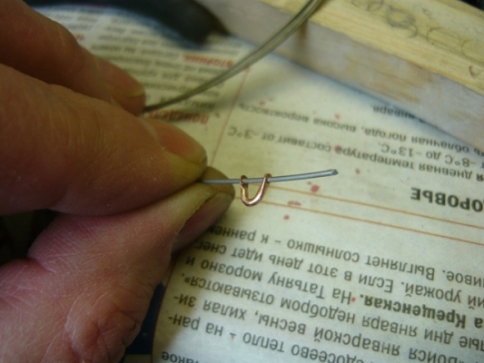 Для изготовления вертушек обычно пользуюсь покупными хомутиками. Но, если срочно надо, а в магазин ехать неохота или нет нужного размера, то можно изготовить и самостоятельно. Порывшись в интернете можно найти много способов изготовления, я ничего нового не дополню, просто попробую проиллюстрировать. Самые простые можно сделать из медной проволоки. Делаем необходимый изгиб, прикладываем к проволоке (воображаемой оси блесны) и откусываем кусачками лишнее, разгибаем проволоку и получаем образец необходимой длины. Заготавливаем необходимое кол-во. Затем плоскогубцами (или молотком на наковальне) расплющиваем концы проволоки.