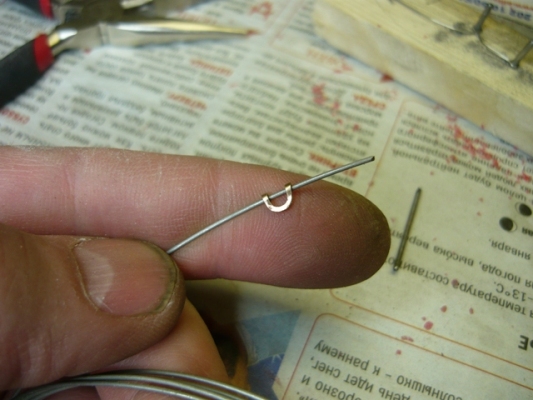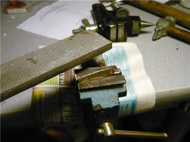 Вынимаем проволоку. Надфилем (бормашина или дремел очень могут помочь на этом этапе) выпиливаем внутренний радиус будущего хомутика, периодически примеряя его на проволоку.
