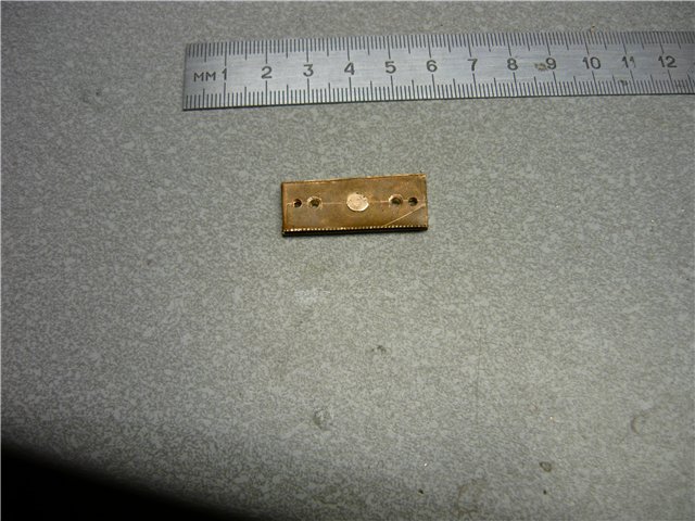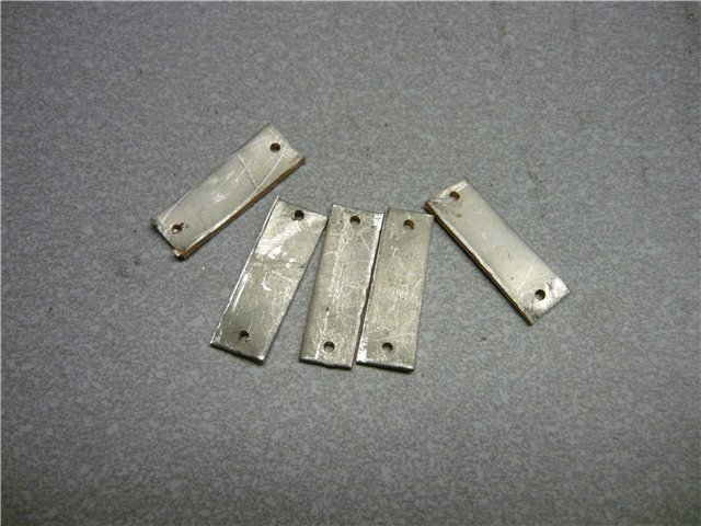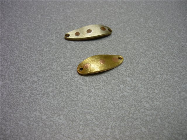Определяемся с размером. В соответствии с этим делаем две заготовки, в данном случае - медь и латунь. В одной заготовке сверлим по краям отверстия под заводные кольца, одно по центру и по одному между центральным и заводными - для заклёпок. Во второй заготовке сверлим пока только одно отверстие по центру. Зенкуем под шляпки заклёпок. Вствляем в центральное отверстие заклёпку, соединяем пластины и склёпываем. Через уже просверленные отверстия в одной заготовке сверлим, как по кондуктору, отверстия во второй, зенкуем, вставляем заклёпки и клепаем. Придаём заготовкам очертания будущей блесны. По технологии, описанной выше, штампуем колебалку необходимой нам геометрии.