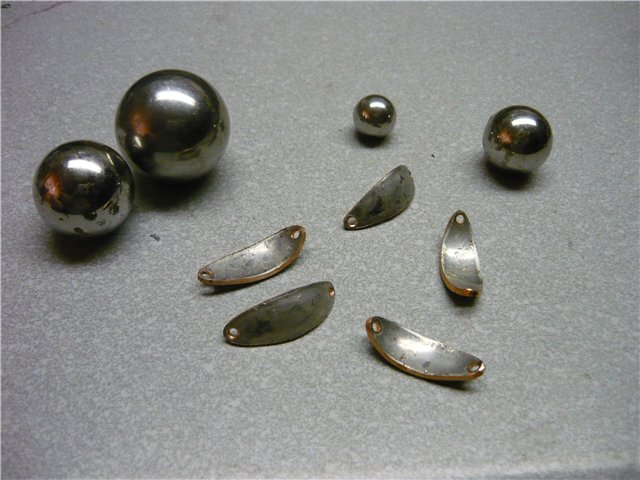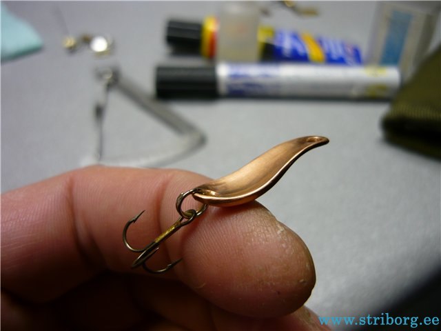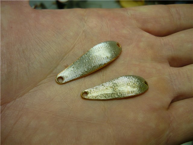 Гоняем блёсенки в ванной, если игра не устраивает, корректируем геометрию или уплощая,постукивая молотком, положив на наковальню, или выгибая шаром в свинце. Гоняем, пока не добьёмся необходимого результата. Сразу может не получиться и на пятый раз может не получиться (сколько я в своё время металла перепортил...), но если будет желание - получится ОБЯЗАТЕЛЬНО, даже не сомневайтесь, потом ещё и меня учить будете. Окончательная проверка уже с заводными кольцами и крючками. В принципе, можно уже ловить, но ведь это УЛЬТРАЛАЙТОВЫЕ блёсны, а значит, должны быть красивыми, по умолчанию.