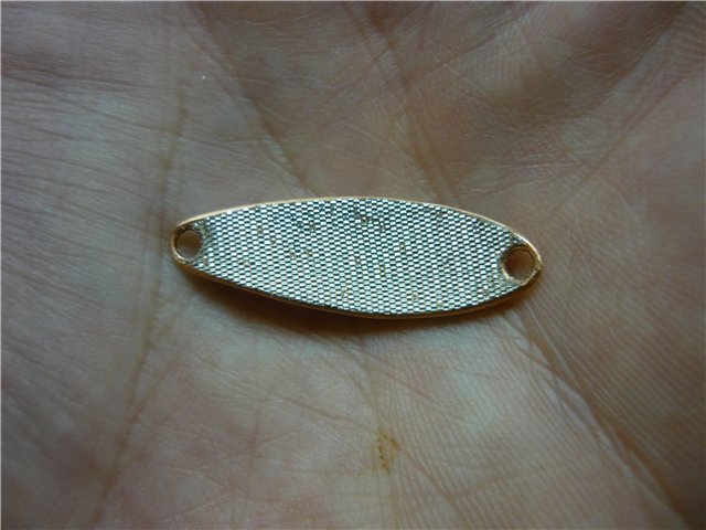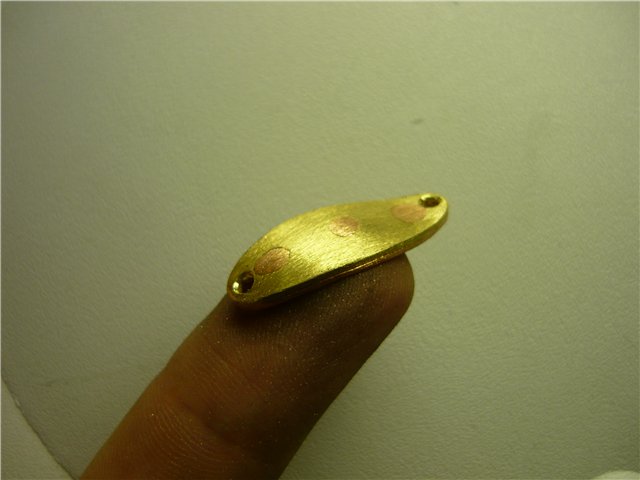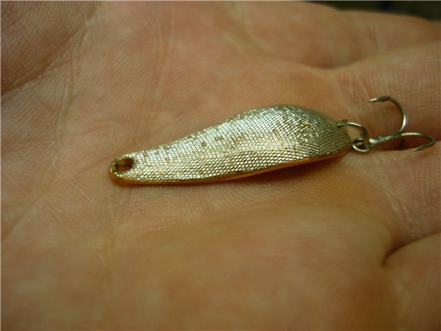 Если толщина блесны 0.5 - 1 мм., то края обрабатываем наждачкой, намотанной на брусок и полируем тряпочкой, смазанной пастой ГОИ. Если толщина 1.5 - 2.5 мм., можно края закруглить. С наружной поверхности блесны напильником сводим толщину металла к краям практически на нет. Затем зачищаем наждачкой и при желании полируем. Мне больше нравятся тёмные окислившиеся блёсны, но иногда нужны и полированные. Есть у меня пластинки меди с серебристо матовым покрытием, иногда оставляю его с двух сторон, иногда только с одной, а вторую сошлифовываю. Такая комбинация бывает очень даже рабочей. (https://picasaweb.google.com/1008308230 ... k5xxordamw ) В последнее время мне понравилось покрывать блёсенки парчой, как на воблерах Лешека Дылевского (LD).