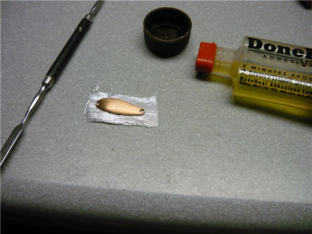 Для этого вырезаем парчу по размеру блесны, но с небольшим запасом. Обезжириваем поверхность и наносим слой двух- или пятиминутной эпоксидки. Накладываем парчу на поверхность блёсенки, обжимаем через тонкий полиэтиленовый пакет, чтобы не прилипало и не пачкалась поверхность. Далее кладём на заранее подготовленную пенку, накрываем деревяшкой и прижимаем чем-нибудь тяжёлым. После застывания клея обрезаем излишки парчи. При желании тоже самое делаем с другой стороны.