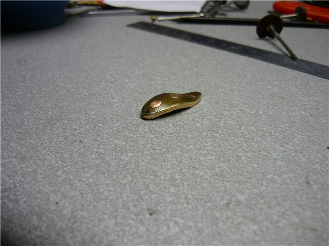 Делать это надо очень осторожно, чтобы сохранился внутренний прогиб по всей длине блесны, в этом свинец очень помогает. Получаем уже что-то похожее на блесну.