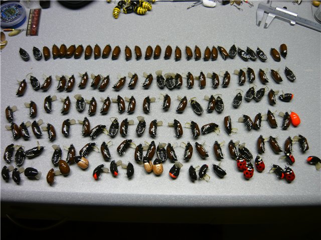 Делаем форму по технологии, аналогичной рассказанной ранее о воблерках. Получаем плавающего пенополистиролового жука. Из проволоки делаем петли и выбрав нужное место для них, вставляем в наш воблерок. Если предполагается сделать жучка с лопаткой как у воблера, то делаем прорезь под лопатку, заполняем её пластилином и подбираем лопатку нужного размера и формы. С помощью пластилина фиксируем необходимый наклон лопатки. Тестируем в ванной. При необходимости делаем огрузку свинцовыми дробинками. Я наношу тонкую полоску пластилина или липкого воска вдоль брюшка и подбираю размер и место для огрузки. Добившись в ванной необходимой игры, запоминаем размер и место огрузки, аккуратно заглаживаем пластилин вокруг лопасти и делаем из самотвердейки уже окончательную рабочую модель с лопастью (если надо) и петлями. Делаем, теперь уже рабочие гипсовые формы, вставляем в них лопатки (если есть возможность, можно нарезать лазером) и проволочный каркас с огрузкой .