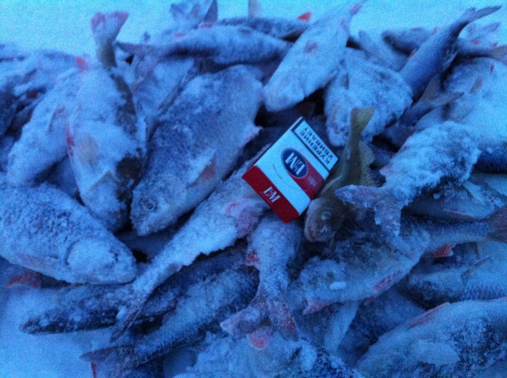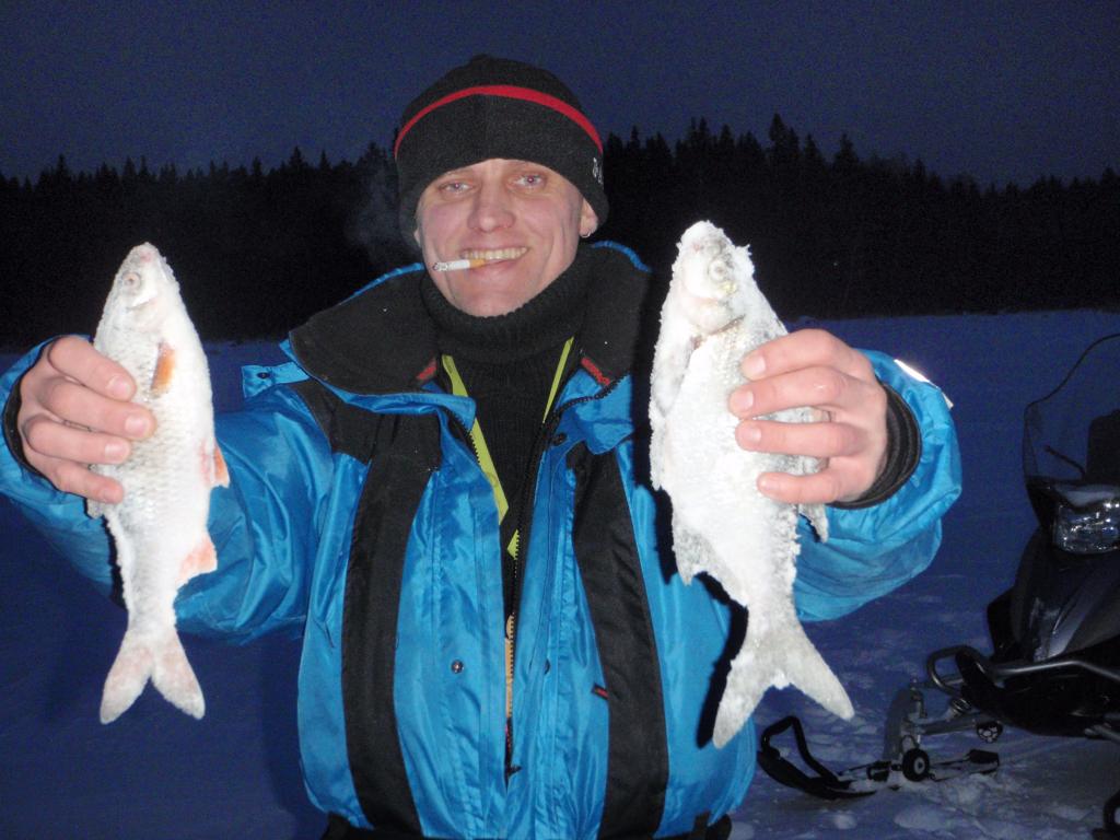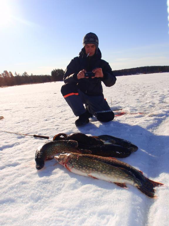 В этот день рыба забегала. Пришлось за плотвой бегать следом,но к вечеру около 20.кг. насобирали на троих. В обед,опять яишенка,но что особенно радует в Финляндии,так это то что можно всё на льду тупо бросить и уехать...